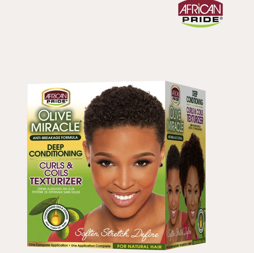 Olive Miracle Curls and Coils Texturizer softens, stretches, and defines all hair textures. Enriched with Olive Oil, Shea Butter, and nourishing herbal extracts, it deeply conditions and moisturizes your hair.