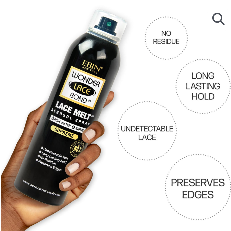 Introducing the MELT line of the Wonder Lace Bond Collection. Like the name says it all, this spray will MELT you lace down! Super compatible with our Wonder Lace Bond Adhesive and spray for stronger hold but it has secure hold to be used alone as well. Our Lace Melt spray is formulated with Rose water and Biotin to make sure your scalp and hairlines are protected.